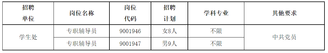 本次专职辅导员招聘计划17人,其中女性8人、男性9人,全部纳入学校正式事业编制,具体招聘计划如下: