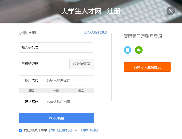 找到大学生人才网网站首页左上方会员登录界面,点击立即注册,进入求职注册页面填写相关注册信息,点击注册按钮提交,填写简历即可。