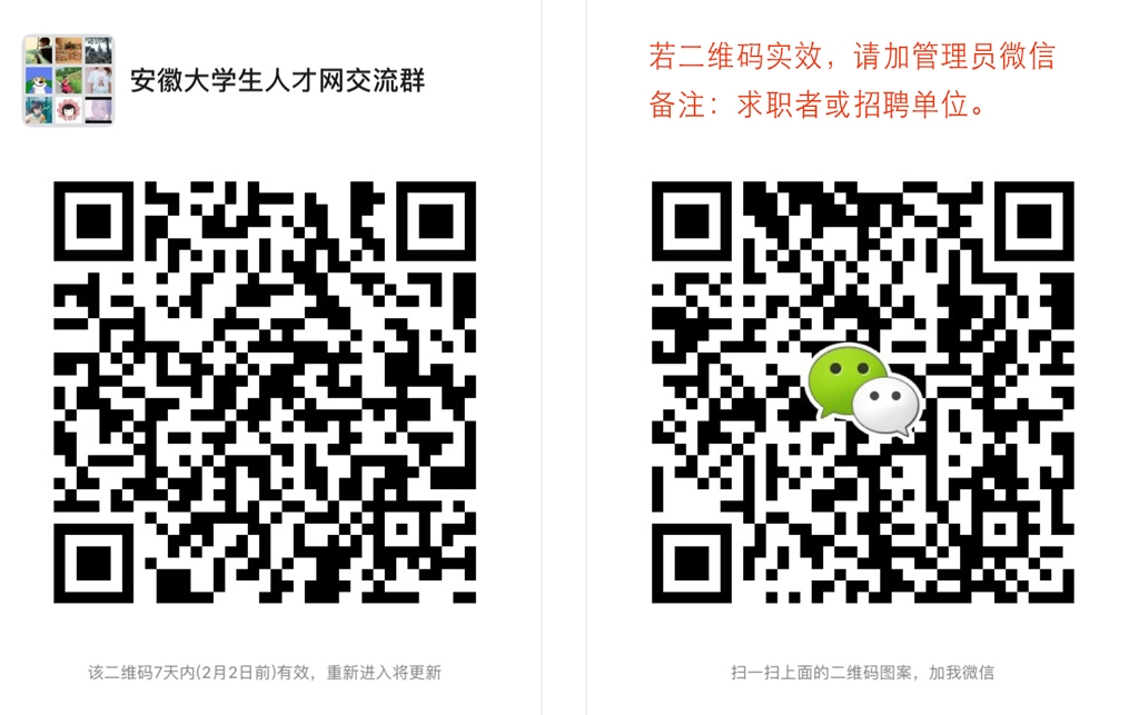 为更好的沟通需要,现开通安徽大学生人才网微信交流群,限求职者、招聘单位加入。若二维码实效,请加管理员微信,备注:求职者或招聘单位。